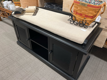 BLACK STORAGE BENCH, TAN FABRIC TOP, 2 CABINET DOORS