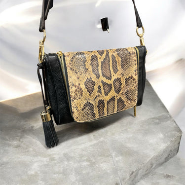 CROSS BODY, BROWN LEATHER w/ SNAKE SKIN, DOUBLE ZIPPER