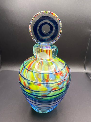HAND BLOWN GLASS MULTI COLOR PERFUME BOTTLE w/ HANDLE and LID, 4.5" x 8"