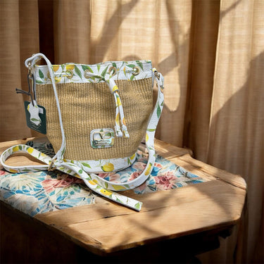 VALENTINA RAFFIA LEMON PRINT LEATHER TRIM BUCKET CROSSBODY