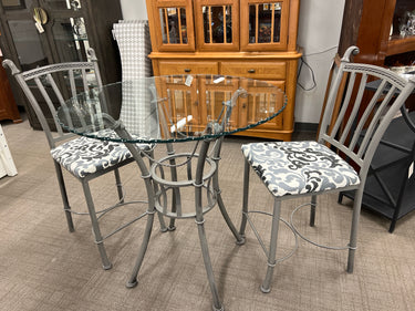 3 PIECE ROUND GLASS TOP BISTRO TABLE WITH METAL FRAME BASE AND 2 MATCHING UPHOLSTERED STOOLS IN BLACK AND WHITE PATTERN js