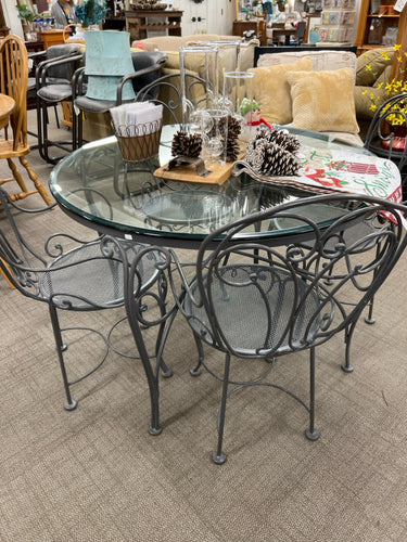 GLASS TOP PATIO WROUGHT IRON LEGS W/4 CHAIRS js