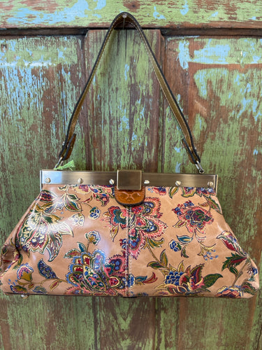 PATRICIA NASH - 14" X 8" TAN LEATHER SATCHEL WITH COLORFUL FLOWERS
