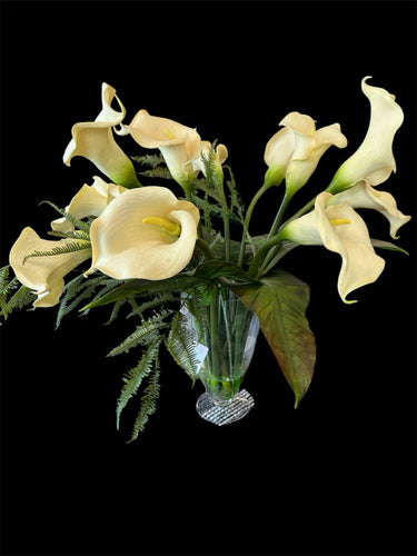 LARGE YELLOW CALIA LILLIES IN CLEAR GLASS VASE