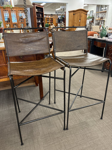 SET OF 2 ELM & IRON WORTHINGTON BAR HEIGHT STOOLS METAL FRAME VEGAN LEATHER SEAT