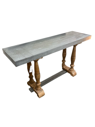 SOFA TABLE, GALVANIZED TOP WITH DECORATIVE NAIL HEADS, WOODEN LEGS