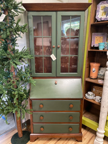 NATURAL AND PAINTED GREEN JASPER HUTCH/DESK, 2 GLASS SHELVES, 3 DRAWERS tmh