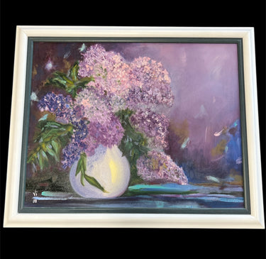 VI DORNER LILAC IN VASE OIL PAINTING WITH WHITE FRAME PURPLES AND BLUES js