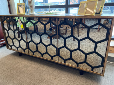 ARHAUS, CONSOLE TABLE, MERCURY GLASS, HONEYCOMB METAL DESIGN, 3 DOORS, "AS IS"